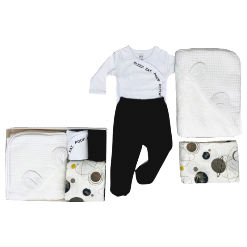 • סט בגד גוף בגזרת מעטפת בצבע לבן  (NB-3) עשוי 100% כותנה רכה ונעימה עם עיצוב ייחודי ומקורי ומכנס רגלית בצבע שחור.