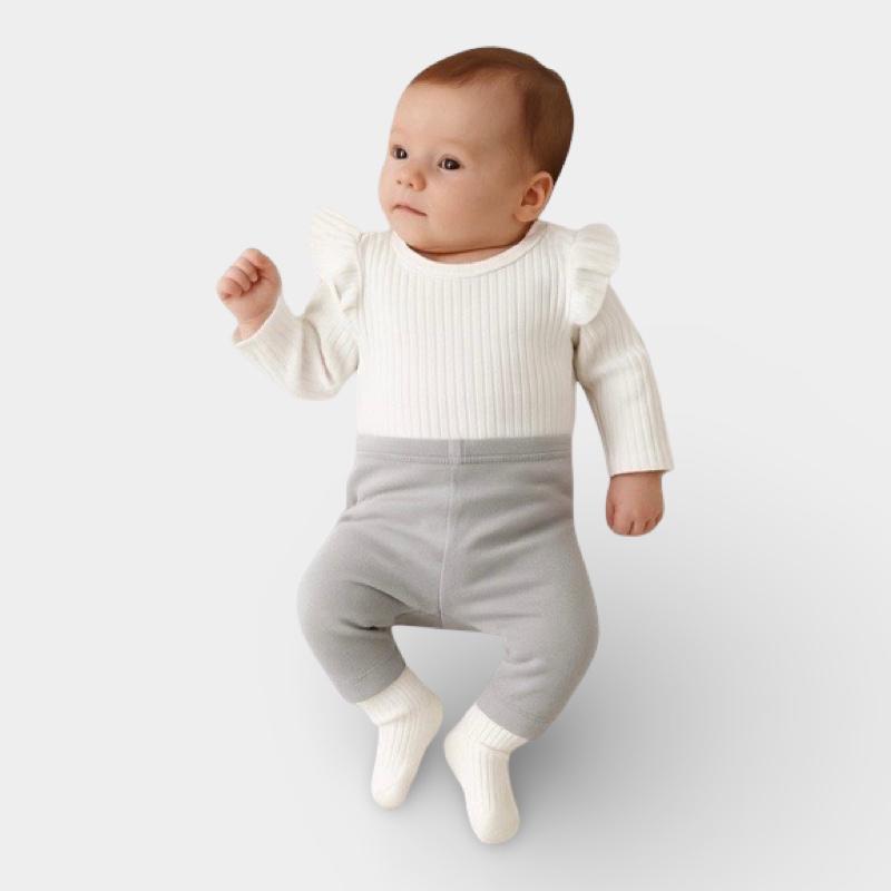 סט ניובורן , בגד גוף ריב לבן עם מלמלה בכתפיים ומכנסי טייץ עשויים 100% כותנה רכה ונעימה לעור הבייבי.